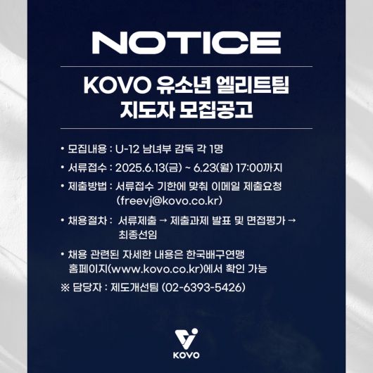한국배구연맹(KOVO)은 13일부터 23일 오후 5시까지 KOVO 유소년 엘리트팀 지도자를 모집한다.