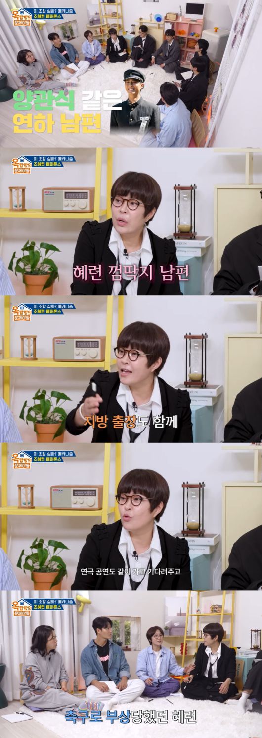 조혜련은 이에 동의하면 "양관식을 보면 가끔 어떨 때는 '너무 붙어 다닌다' 싶을 정도로 애순이만 보잖아요. 남편도 그런 부분이 없지 않아 있다"라고 말했다. 이에 김숙이 "너무 불안해서 붙어 다니나"라고 농담하자, 조혜련은 "그것도 없지 않아 있다"고 받아쳐 웃음을 자아냈다.