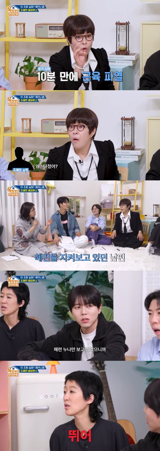 하지만 조혜련은 "뛰었다가는 근육이 더 쫙 찢어진다. 말리듯이. 관중석에 서포터즈가 있다. 남편을 봤는데 남편이 '왜? 다쳤어? 하더니 '누워' 이랬다"라고 말했다. 이에 송은이가 "남편만 사인을 안 거다"라고 놀라워했고, 주우재도 "누나만 보고 있으니까"라고 거들었다.