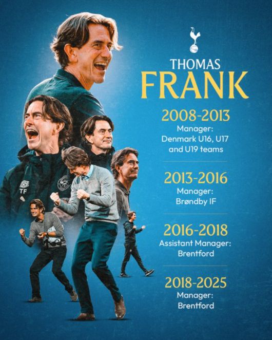 토트넘은 13일(한국시간) 브렌트퍼드를 지휘하던 프랑크 감독 선임을 공식 발표했다. 계약기간은 2028년까지다. 현지 매체에 따르면 토트넘은 프랑크 감독을 데려오기 위해 브렌트퍼드에 1000만 파운드(약 184억원) 이상 지불한 것으로 알렸다.