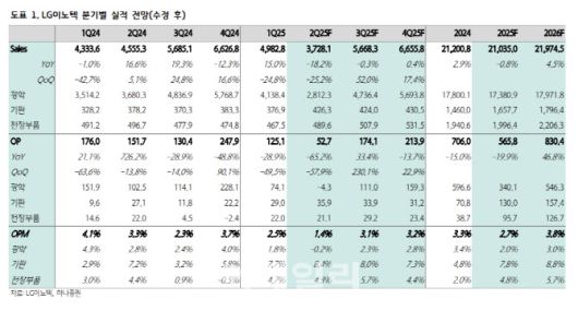 김민경 하나증권 연구원은 “LG이노텍의 올해 2분기 매출액은 전년 대비 18% 감소한 3조7281억원, 영업이익은 65% 줄어든 527억원을 기록할 전망”이라며 “환율 하락세가 지속하며 달러 매출 비중이 높은 광학솔루션 사업부의 2분기 이익 추정치를 하향 조정했다”고 밝혔다.