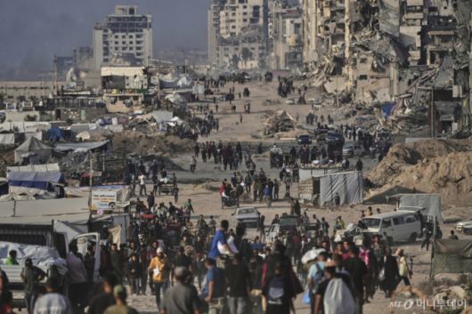 지난 9일(현지시간) 가자지구 가자시티에서 팔레스타인 난민들이 파괴된 건물 잔해가 즐비한 해안가를 따라 이동하고 있다. /가자시티 AP=뉴시스 |