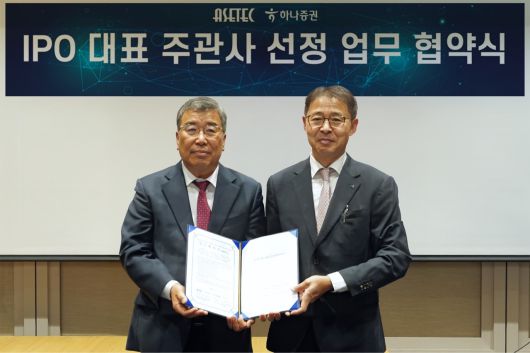 권승택(오른쪽) 하나증권 ECM본부장과 박종석 아세테크 대표이사가 IPO 대표 주관사 계약을 맺고 기념촬영하고 있다. [하나증권 제공] |