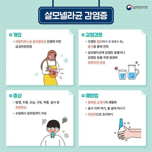 살모넬라균 감염증은 오염된 음식 섭취를 통해 발생하며, 주로 덜 익힌 달걀, 가금류를 통한 전파가 많기 때문에 조리 시에는 중심온도 75℃가 1분 이상 되도록 충분히 익혀먹어야 한다. 또 달걀을 만진 뒤에는 세정제를 이용해 손을 깨끗이 씻고 위생적으로 조리해야 한다.
