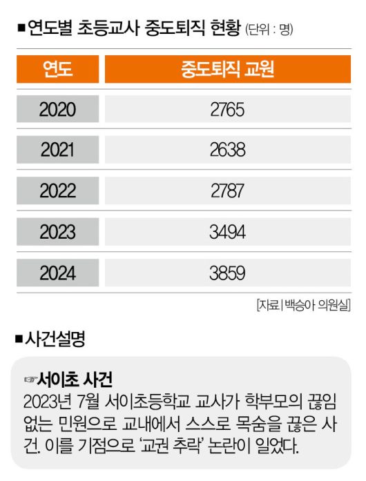 3만6748명. 최근 5년간 교단을 떠난 선생님의 숫자다(백승아 의원실ㆍ교육부). 이중 42.4%(1만5543명)는 초등학교 교사다. 특히 2024년 한해 교단을 떠난 초등교사는 3859명으로 사상 최대치를 찍었다. 2023년 사상 처음으로 3000명을 넘었는데, 불과 1년 만에 최고 기록을 갈아치웠다.