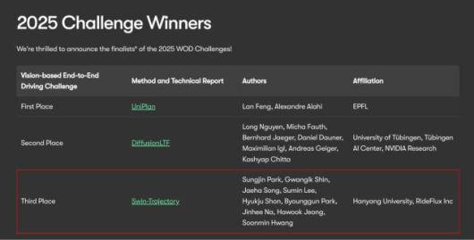 라이드플럭스는 이번 챌린지에 한양대학교 IRCV 연구팀과 공동으로 참가해 웨이모가 공개한 카메라 영상 데이터를 기반으로 자율주행차의 이동 경로를 효과적으로 계획하는 모델을 제안했다. 비전 기반 E2E 자율주행 부문은 엔비디아, 샤오미, 스위스 로잔연방공대, 캐나다 밀라(MILA) 인공지능(AI) 연구소 등 전세계에서 29개 자율주행 연구개발팀이 참가해 웨이모 챌린지 전체 부문 중 가장 경쟁이 치열했다.
