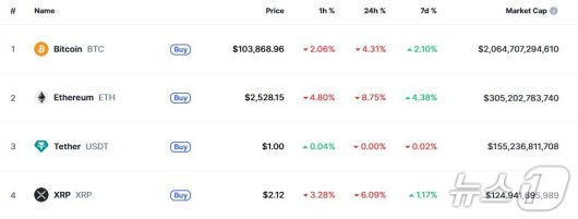 13일 오전 9시 50분 현재 글로벌 코인 시황 중계 사이트인 코인마켓캡에서 비트코인은 24시간 전보다 4.31% 급락한 10만3868달러를 기록하고 있다.