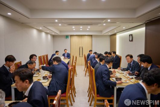 [서울=뉴스핌] 이재명 대통령이 지난 12일 서울 용산구 대통령실 구내식당에서 사진·영상 기자단과 점심을 먹고 있다. [사진=대통령실] 2025.06.13 photo@newspim.com