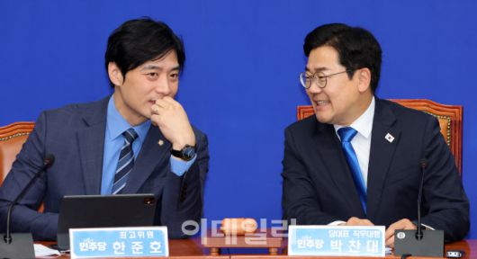 [이데일리 방인권 기자] 박찬대 더불어민주당 당대표 직무대행 겸 원내대표(오른쪽)와 한준호 최고위원이 13일 서울 여의도 국회의사당에서 열린 '더불어민주당, 최고위원회의'에서 이야기를 나누고 있다.