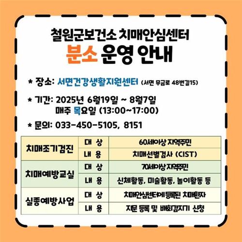 철원군보건소 치매안심센터 서면분소 운영 안내 |