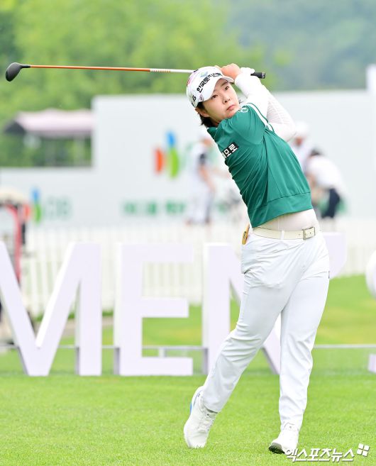 (엑스포츠뉴스 음성, 김한준 기자) 13일 오전 충북 음성 레이보우힐스 컨트리클럽(파72ㅣ6,767야드)에서 열린 'DB그룹 제39회 한국여자오픈골프선수권대회'(총상금 12억 원, 우승 3억 원) 2라운드 경기, 박지영이 10번홀 티샷을 날리고 있다.김한준 기자 kowel@xportsnews.com