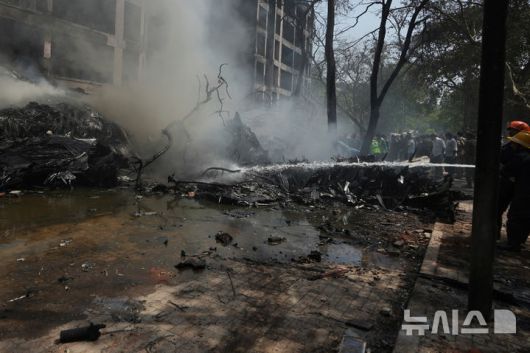 [아마다바드=AP/뉴시스] 12일(현지 시간) 인도 구자라트주 아마다바드에서 발생한 여객기 추락 사고 현장에서 소방대원들이 화재 진압을 하고 있다. 이날 오후 아마다바드 공항에서 이륙한 영국행 에어인디아 AI171편 여객기가 추락해 탑승자 242명 가운데 1명을 제외한 전원이 숨졌으며, 추락 현장의 학생 등 약 50명도 사망한 것으로 전해졌다. 2025.06.13. |