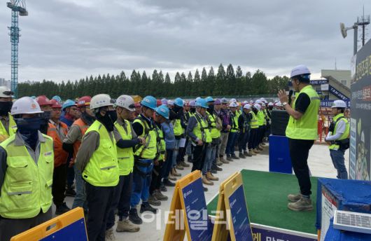 이정렬 반도건설 시공부문 대표가 고양 장항 카이브 유보라 현장 근로자를 대상으로 온열질환 예방 교육 중이다. (사진=반도건설) |
