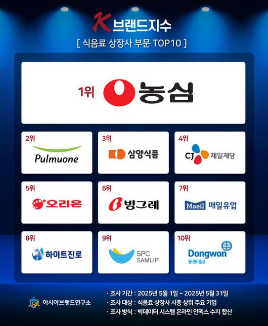 이번 K-브랜드지수 식음료 상장사 부문은 식음료 상장사 시총 상위 주요 기업을 대상으로, 2025년 5월 1일부터 5월 31일까지의 온라인 빅데이터 3069만 2131건을 분석해 진행됐다.