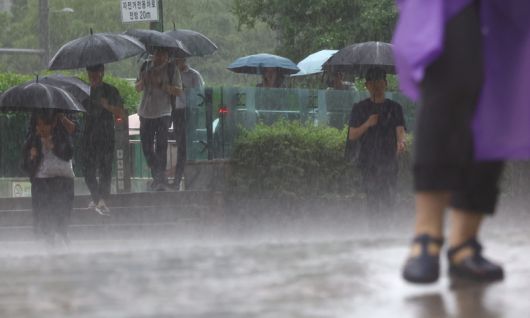 서울 중구 세종대로 사거리에서 우산을 쓴 시민들이 발걸음을 재촉하고 있는 모습. 뉴시스 |