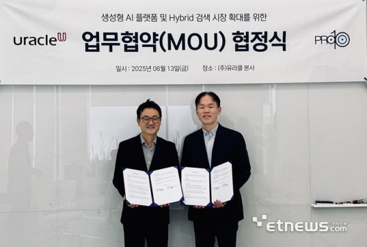AI·모바일 플랫폼 전문기업 유라클(대표 조준희, 권태일)은 13일 AI 기반 검색 솔루션 전문 기업 프로텐(대표 박재완)과 함께 생성형 AI 플랫폼 및 하이브리드(Hybrid) 검색 솔루션의 공동 확대를 위한 전략적 업무협약(MOU)을 체결했다고 밝혔다.