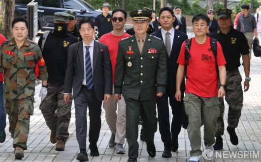 [서울=뉴스핌] 양윤모 기자 = 이재명 대통령이 채상병 특검으로 이명현 전 국방부 검찰단 고등검찰부장을 지명한 가운데, 해병대 '채 상병 순직 사건'과 관련해 항명 및 상관명예훼손 혐의로 기소된 박정훈 전 해병대 수사단장(대령)이 13일 서울 서초구 서울고등법원에서 열린 항소심 첫 공판에 출석하기위해 이동하고 있다. 2025.06.13 yym58@newspim.com