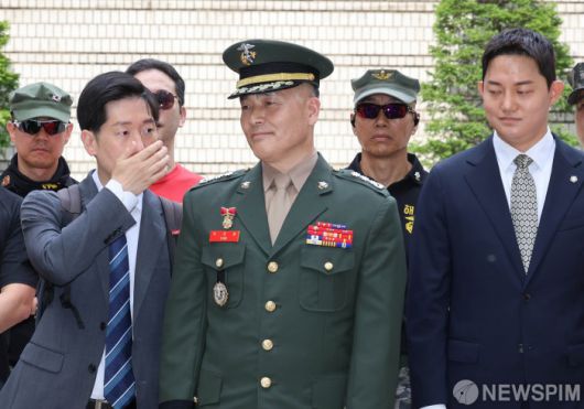 [서울=뉴스핌] 양윤모 기자 = 이재명 대통령이 채상병 특검으로 이명현 전 국방부 검찰단 고등검찰부장을 지명한 가운데, 해병대 '채 상병 순직 사건'과 관련해 항명 및 상관명예훼손 혐의로 기소된 박정훈 전 해병대 수사단장(대령)이 13일 서울 서초구 서울고등법원에서 열린 항소심 첫 공판에 출석 변호인들과 대화하고 있다. 2025.06.13 yym58@newspim.com |