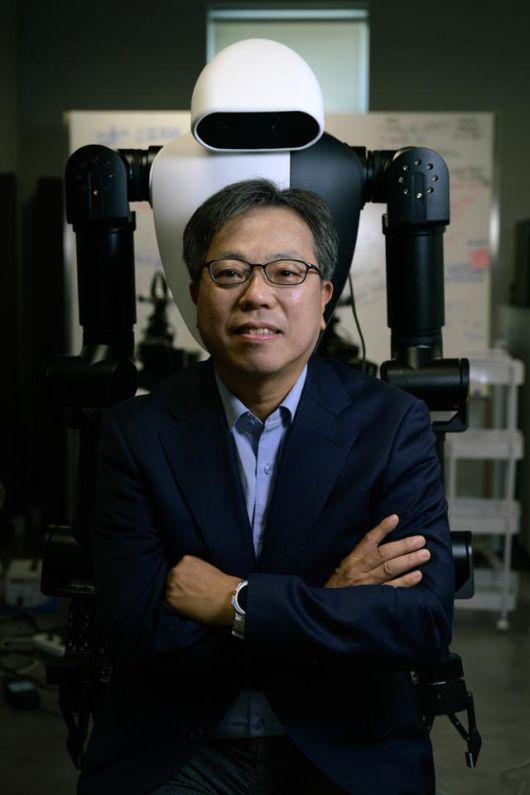 한국의 당면한 핫이슈를 만드는 사람, 그 사람의 이야기를 들려드립니다.지난 9일 서울 관악구 서울대 해동첨단과학관에서 장병탁 AI연구원장이 지금 개발 작업이 진행 중인 '행동형 AI' 앞에서 포즈를 취하고 있다. 행동형 AI는 인간 행동을 모방학습해 인간과 비슷하게 작업하는 것을 목표로 한다. 하상윤 기자 |