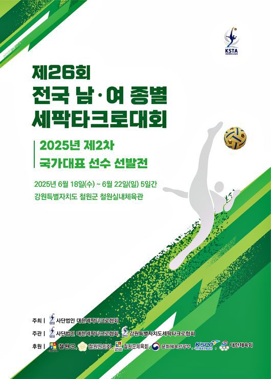 대한세팍타크로협회는 오는6월18일부터22일까지5일간,강원특별자치도 철원군 철원실내체육관에서 제26회 전국 남·여 종별 세팍타크로대회를 개최한다고 밝혔다. / 대한세팍타크로협회 |