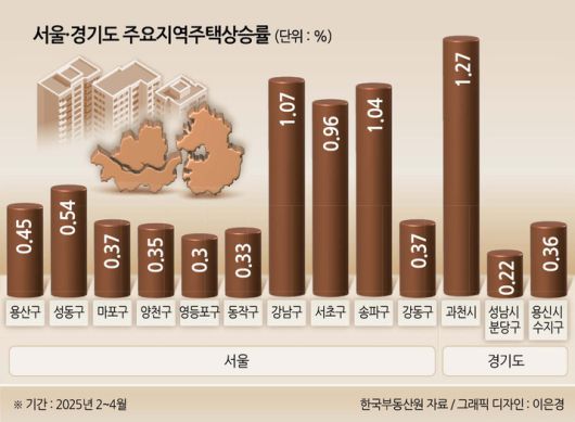 서울은 이미 전 자치구의 40%가 해당 조건을 충족했다. 이전부터 투기지역으로 지정돼 있던 강남 3구(강남·서초·송파)와 용산구 외에도 마포구와 성동구가 토지거래허가구역(토허구역) 재지정에 대한 반사이익을 보며 주택 가격이 급증했다. 특히 성동구는 지난 3월 0.9%의 상승폭을 보이며 그 전달(0.13%)보다 7배 가까이 빠른 속도로 집값이 올랐다.