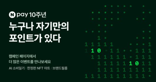 또 Npay를 사용해온 시간에 대한 감사의 마음을 담은 'Npay 멤버' 대체불가능토큰(NFT) 아트가 사용자의 Npay 월렛에 발급된다. 'Npay 멤버' NFT 아트를 소지한 사용자는 연내 진행되는 다른 프로모션에서 특별한 우대 혜택이 제공될 예정이다. Npay 누적 포인트 적립 금액에 따른 '포인트 레벨' NFT 아트도 지급된다. 포인트의 총 누적 적립액이 100만~1000만원, 1000만~1억원, 1억원 이상 등 적립액 구간에 따라 해당하는 NFT 아트가 지급된다.