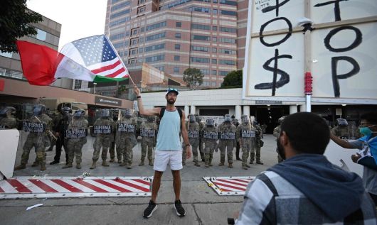 12일 로스앤젤레스 시내 연방청사 밖에서 연방 이민 단속에 대응한 시위가 계속되는 가운데 한 시위자가 캘리포니아 주 방위군 대원들 앞에서 미국과 멕시코 국기가 결합된 깃발을 흔들고 있다. 로스앤젤레스/AFP 연합뉴스 |