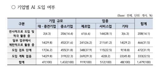 글로벌 인공지능(AI) 기술 패권 경쟁이 심화 하고 있지만 국내 기업의 AI 활용 수준은 여전히 매우 낮은 것으로 나타났다. 중소기업은 물론이고 대기업과 중견기업 중에서도 AI를 도입하지 않은 기업이 부지기수인데다, 필요성을 인지하지 못하는 기업도 많았다.