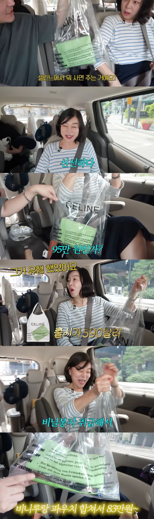 제작진은 최화정의 다리 위에 놓인 명품 브랜드 셀린느의 로고가 세겨진 투명 가방에 "이거는 셀린느냐. 파는 거냐 아니면 셀린느에서 뭐 사면 주는 거냐"고 물었다.
