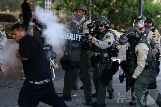 11일(현지시간) 미국 캘리포니아주(州) 로스앤젤레스(LA)에서 연방 이민 단속에 반대하는 시위가 벌어진 가운데 한 법 집행관이 시위대를 향해 비살상 무기를 발사하고 있다. 25.06.11 ⓒ 로이터=뉴스1 ⓒ News1 김예슬 기자 |