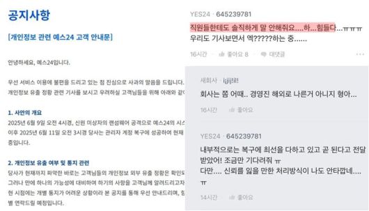 예스24 직원의 댓글도 공유됐다. 예스24 직원은 "우리한테도 솔직하게 말 안 해준다. 힘들다. 기사 보면서 놀라고 있다"고 적었다.