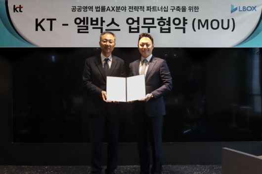 KT는 리걸테크 전문기업 엘박스와 공공 분야 인공지능 전환(AX) 경쟁력 강화를 위한 업무협약을 체결했다고 13일 밝혔다. 양사는 공공기관의 디지털 전환을 가속화하고, 국내 리걸테크 시장의 성장을 선도하는 데 협력의 뜻을 모았다.