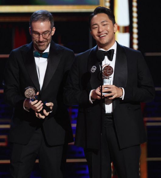 뮤지컬 ‘어쩌면 해피엔딩’의 작곡가 윌 애런슨(왼쪽), 작가 겸 작사가 박천휴가 9일 미국 뉴욕에서 열린 제78회 토니상에서 음악상을 수상한 뒤 소감을 말하고 있다.(사진=로이터) |
