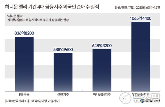 [서울=뉴스핌] 송주원 기자 = 우리금융지주(회장 임종룡)에 대한 투심이 외국인을 중심으로 살아나고 있다. 이재명 출범 후 허니문 랠리 기간 외국인 순매수 규모가 4대 금융지주(KB·신한·하나금융·우리금융) 가운데 유일하게 1000억원을 넘어서며 코스피시장 외국인 순매수 상위 종목 10위권 안에 진입했다.