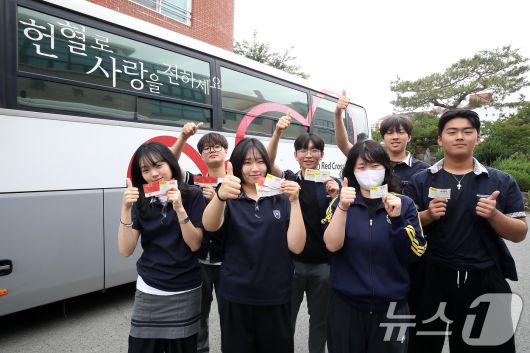 (대구=뉴스1) 공정식 기자 = 세계 헌혈자의 날을 하루 앞둔 13일 대구 달성군 현풍고등학교 학생들이 학교를 방문한 대한적십자사 대구경북혈액원 헌혈버스에서 헌혈에 동참한 고3 학생들이 기념촬영을 하고 있다. 이날 수학여행을 떠난 1학년 학생을 제외하고 2·3학년 324명 가운데 100여 명의 학생이 헌혈에 참여했다. 2025.6.13/뉴스1