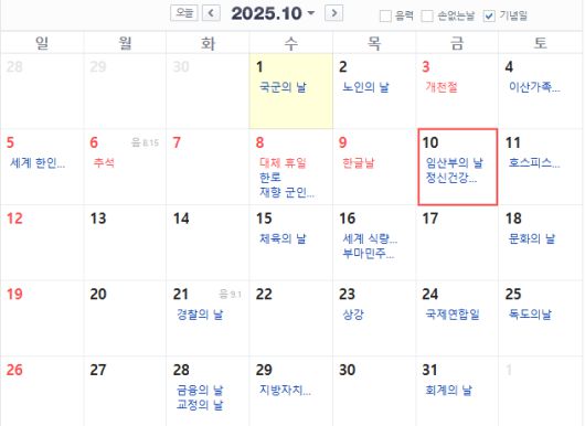 오는 10월 10일 임시공휴일이 지정되면 열흘간 연휴가 가능해진다. [사진 = 네이버 달력 캡처] |