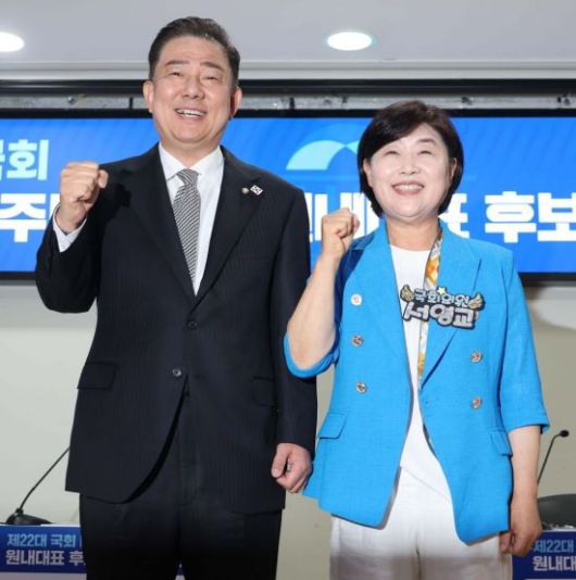 10일 국회 의원회관에서 열린 더불어민주당 제22대 국회 2기 원내대표 후보 합동 토론회에서 후보로 나선 김병기 의원(왼쪽)과 서영교 의원이 취재진 카메라를 향해 포즈를 취하고 있다. 2025.6.10김현민 기자 |