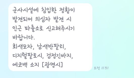 광명시는 '군사시설에 침입한 정황이 발견돼 의심자 발견 시 인근 파출소에 신고해 달라'는 재난문자를 발송했다.