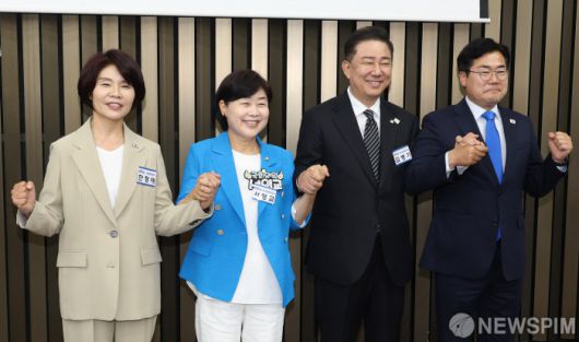 [서울=뉴스핌] 김학선 기자 = 13일 국회에서 열린 더불어민주당 제2기 원내대표 선출 의원총회에서 박찬대 당대표 직무대행(오른쪽부터), 김병기 의원, 서영교 의원, 한정애 선관위원장이 기념촬영을 하고 있다. 2025.06.13 yooksa@newspim.com