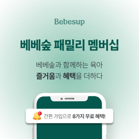 패밀리 멤버십 서비스는 베베숲 공식몰을 통해 베베숲에 관심있는 누구나 무료로 가입 가능하며, 간단한 추가 정보 입력을 통해 고객 맞춤형 서비스를 제공받을 수 있다. 특히 누구나 가입만 해도 총 8가지의 패밀리 전용 혜택을 누릴 수 있어 기대를 모으고 있다.