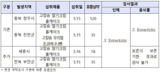 이후 질병청은 올해 신고된 집단 식중독 발생 사례 중 해당 제품과 연관된 것으로 추정되는 추가 사례를 세종시와 부안군에서 2건 발견했다. 이들 2곳 급식소에선 각각 지난달 16일과 15일 '고칼슘 딸기크림 롤케이크'가 제공됐다.