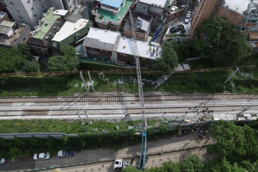 아시아투데이 정아름 기자 = 13일 오전 사다리차가 선로로 넘어지면서 운행을 멈췄던 경의중앙선이 사고 복구를 마치고 이날 13시 30분 열차 운행을 다시 시작했다.