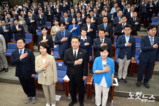 13일 서울 여의도 국회에서 열린 제22대 국회 더불어민주당 원내대표 선출을 위한 의원총회에서 서영교, 김병기 후보자와 의원들이 국민의례를 하고 있다.저작권자 © CBS 노컷뉴스 무단전재 및 재배포 금지