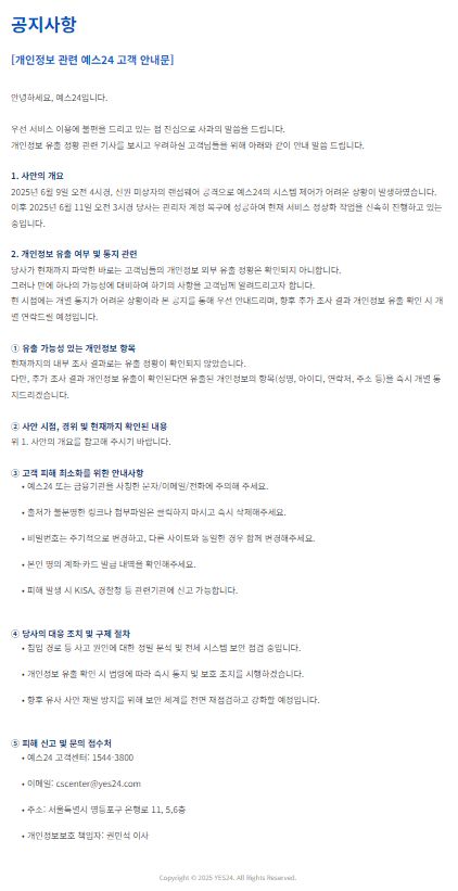 예스24 홈페이지에 올라온 공지사항 전문. 예스24 홈페이지 갈무리 |
