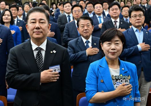 김병기-서영교 더불어민주당 원내대표 후보가 13일 국회에서 열린 더불어민주당 제2기 원내대표 선출 의원총회에서 국민의례를 하고 있다. /이병화 기자 |