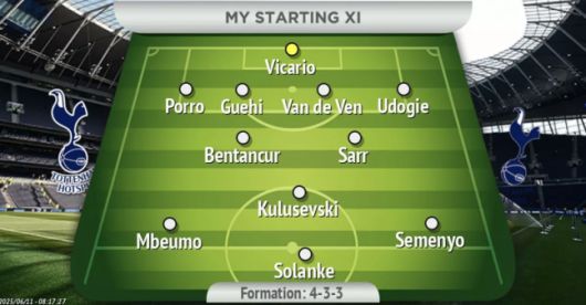 포메이션은 4-3-3을 기반으로 예상했다. 굴리멜모 비카리오가 골키퍼 장갑을 착용했다. 페드로 포로, 마크 게히, 미키 판 더 펜, 데스티니 우도기가 수비진을 구성했다. 로드리고 벤탄쿠르, 데얀 쿨루세브스키, 파페 사르가 중원에 이름을 올렸고 브라이언 음뵈모, 도미니크 솔란케, 앙투안 세메뇨가 공격진에 편성됐다.