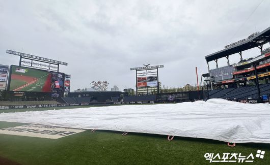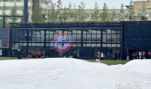 13일 오후 대전 한화생명 볼파크에서 열리는 '2025 신한 SOL Bank KBO리그' LG 트윈스와 한화 이글스의 경기, 15시30분 현재 꽤 많은 양의 비가 쏟아지고 있다. 그라운드에 이미 방수포는 깔린 상태. 대전지방기상청은 오후 7시까지 10mm의 비가 내릴 것이라 예보했다.