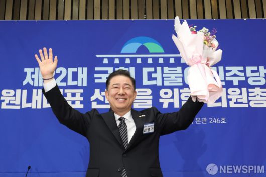 [서울=뉴스핌] 김학선 기자 = 13일 서울 여의도 국회에서 열린 제22대 국회 더불어민주당 제2기 원내대표 선출 의원총회에서 김병기 신임 원내대표가 꽃다발을 들고 기념촬영을 하고 있다. 2025.06.13 yooksa@newspim.com