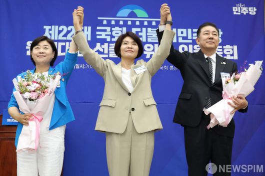 [서울=뉴스핌] 김학선 기자 = 13일 서울 여의도 국회에서 열린 제22대 국회 더불어민주당 제2기 원내대표 선출 의원총회에서 김병기 신임 원내대표가 꽃다발을 들고 참석자들과 기념촬영을 하고 있다. 왼쪽부터 서영교 후보, 한정애 선관위원장, 김병기 신임 원내대표. 2025.06.13 yooksa@newspim.com