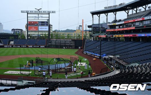 경기가 열릴지는 미지수. 대전 한화생명볼파크에는 비가 내리고 있다. 한화 선수들이 배팅 훈련을 끝내고, 오후 3시 10분쯤 대형 방수포로 그라운드를 덮었다.